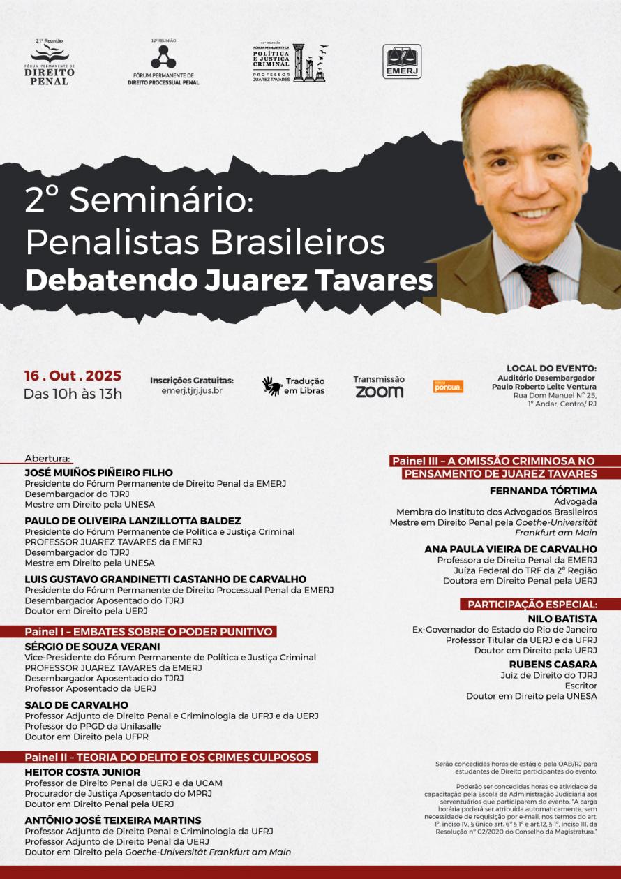 No o 2º Seminário Penalistas Brasileiros, magistrados e outros especialistas vão discutir temas de direito penal e criminologia, sob a ótica do jurista Juarez Tavares, em três painéis, das 10 às 13h. O procurador aposentado Heitor Costa Junior vai participar da segunda mesa, sobre teoria do delito e crimes culposos. O evento contará, ainda, com as participações do ex-governador e doutor em direito Nilo Batista, bem como do juiz e escritor Rubens Casara.