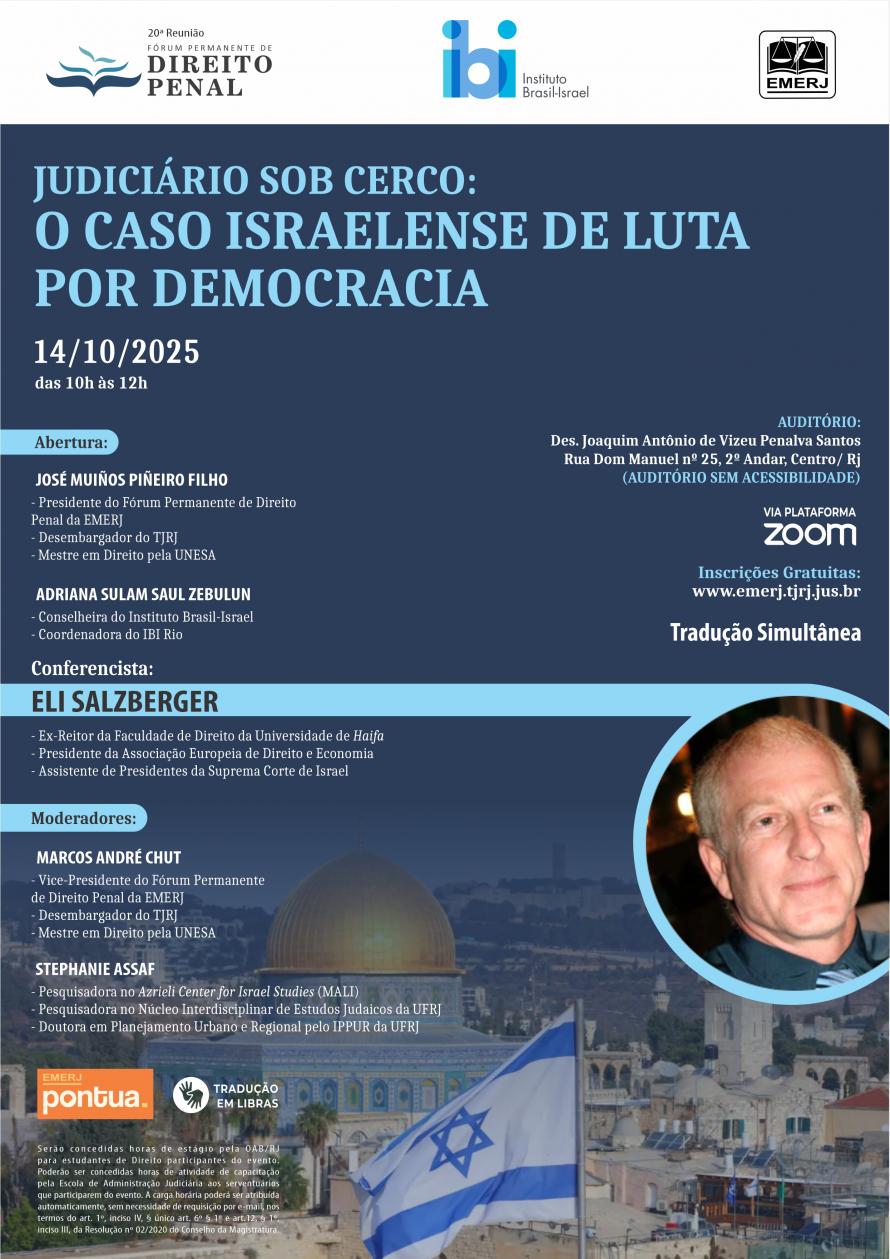 O seminário”Judiciário sob Cerco: O Caso Israelense de Luta por Democracia” será no dia 14, das 10h às 12h. A principal atração será o professor de direito israelense Eli Salzberger, ex-reitor da Universidade de Haifa, ex-presidente da Associação Europeia de Direito e Economia e assistente de presidentes da Suprema Corte de Israel.
