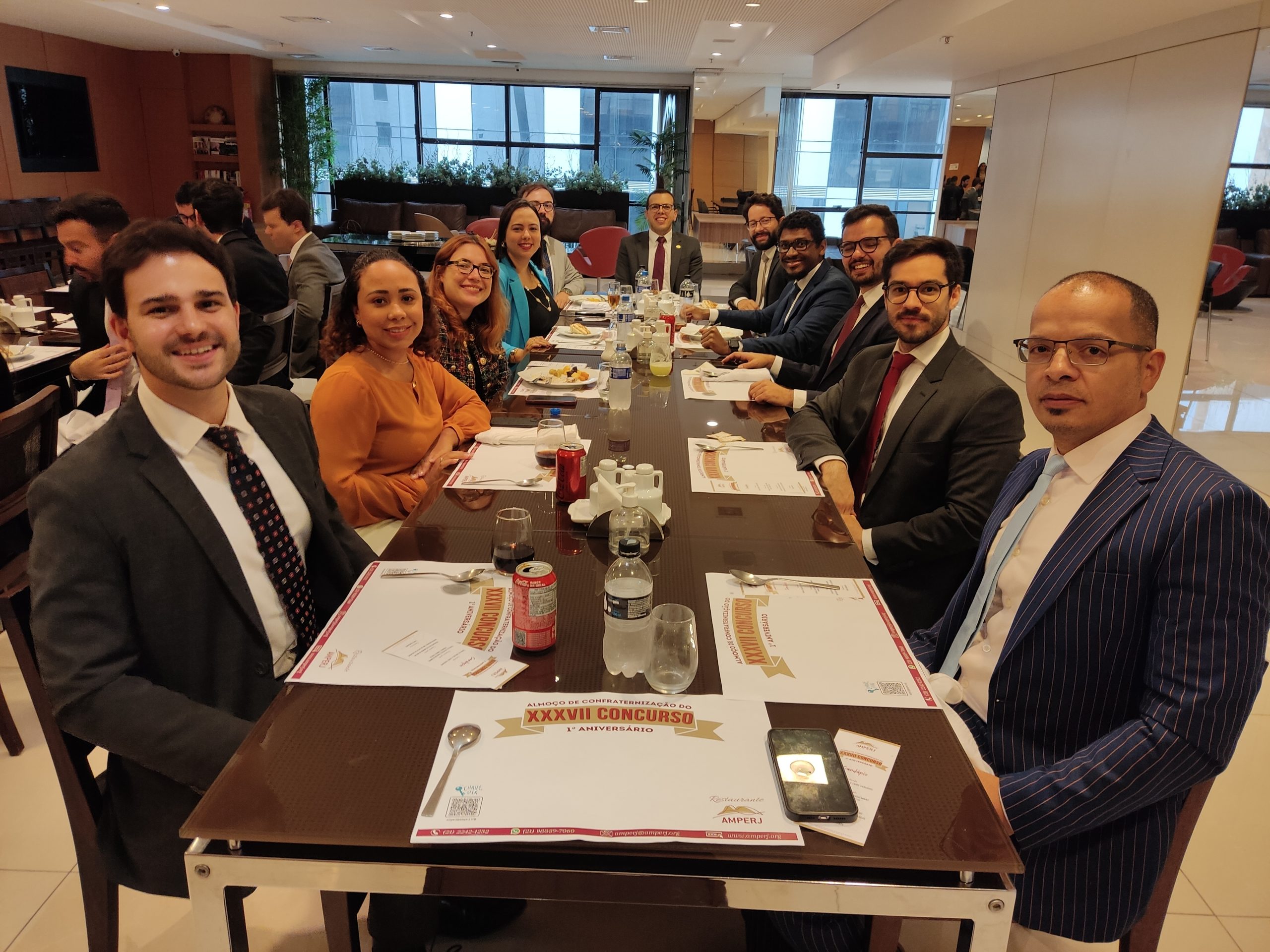 Os aprovados no 37º concurso do Ministério Público se reuniram na sede da Amperj, na tarde desta sexta-feira (10), para celebrar o primeiro aniversário de posse com um almoço especial oferecido pela associação. Entre abraços e boas risadas, os promotores da turma mais jovem do MPRJ trocaram experiências e impressões sobre o início da trajetória na instituição e aproveitaram para reforçar os laços de amizade que vão atravessar o tempo.